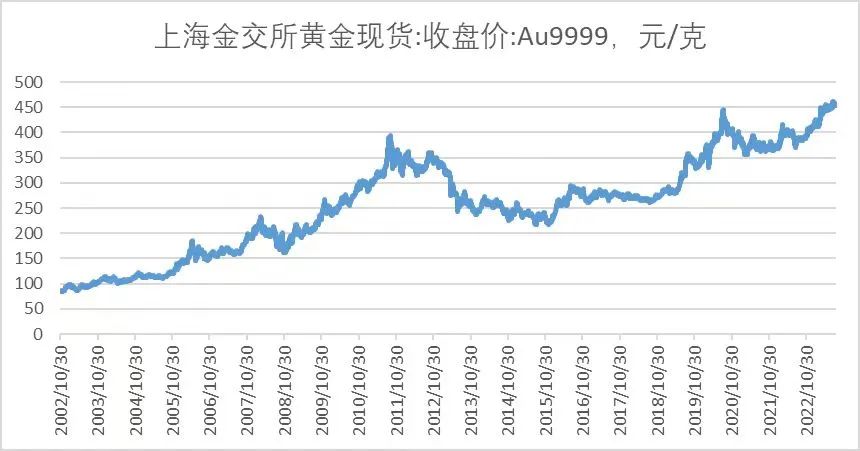 2002年-2022年国内黄金价格变动。(图源/数据来源:上海金交所)