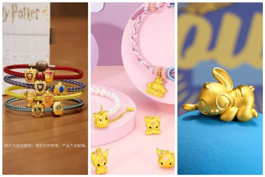 迎合年轻人的审美,金饰的设计也有了更多花样。蝴蝶结、花朵、转运珠,复古国潮抑或是前沿时尚,都稳稳拿捏住了颜值党。除此之外,黄金品牌还与国内外多个知名IP联名,如国家宝藏、哆啦A梦、哈利·波特等等,撩拨着年轻人的心,就算没买过金子也要考虑一下了。