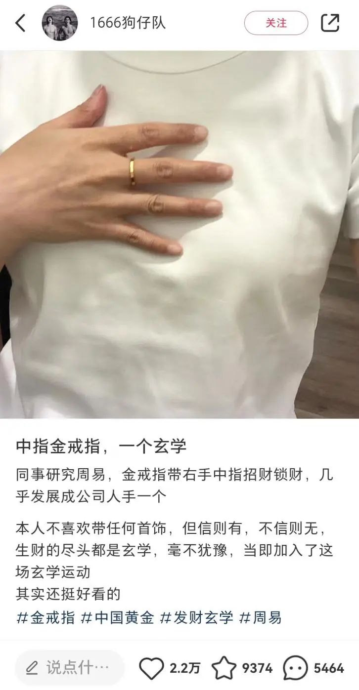 在小红书上,最近流行着“中指戴金戒招财”的江湖传说。有的人上午刷到相关帖子,下午就去买了一个金戒指。