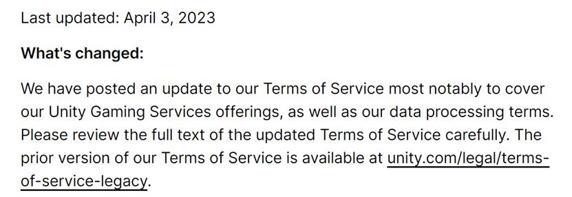 但根据于用户协议(UNITY TERMS OF SERVICE)的约定,Unity保留不时修改这些条款(包括,附加条款)的权利,而无需事先通知。如果Unity修改这些条款,他将在网站上发布修改内容,或以其他方式向开发者提供修改通知。在Unity发出修改通知后,若继续访问或使用“产品”,即表示同意受修改后条款的约束。如果不能接受修改后的条款,唯一的追索权是停止使用服务。这里显然并没有给开发者试用旧条款停留在原始版本的权力。