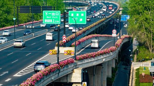 马路护栏、隔离带、高架桥、路灯......目光所及之处皆是花,据说16个品种的月季花,连花期都定好了,准时准点在亚运期间盛开。