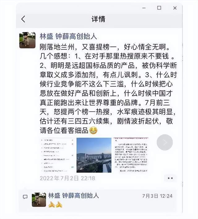 在火烧钟薛高的舆情爆发之时,林盛的言论却如同在“火上浇油”。在朋友圈里,他话里话外指责自己是遭“对手”陷害,热搜“不要钱”、“水军痕迹严重”,被媒体将截图传出后,又引发了不少争议。