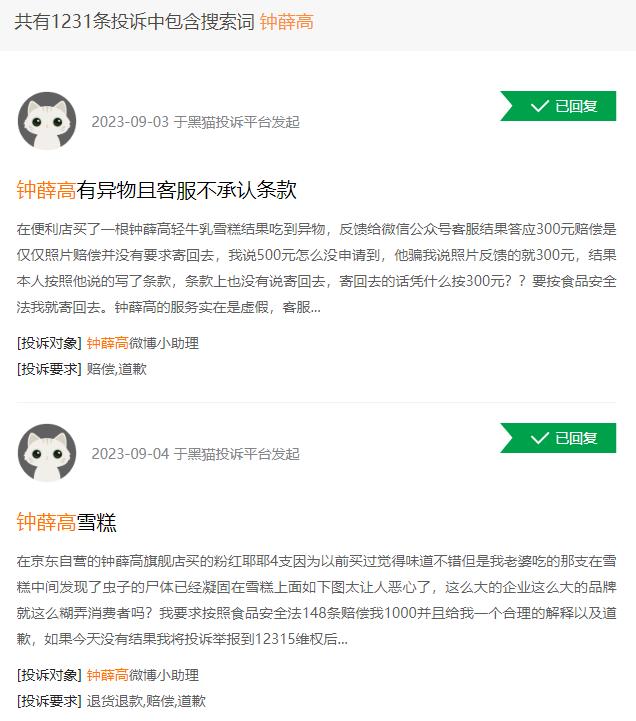 与此同时,关于钟薛高的各种“负面舆情”却还在不断出现:21家分公司被注销、产品频频出现在临期店、550万资产被法院冻结查封……更让人难堪的是,尽管林盛一再表示,所有新的消费品和新的消费模式“必须要以品质作为第一前提”,但是钟薛高被投诉吃出“异物”的报道却是此起彼伏;在黑猫投诉平台上,涉及钟薛高的投诉超过1200条。