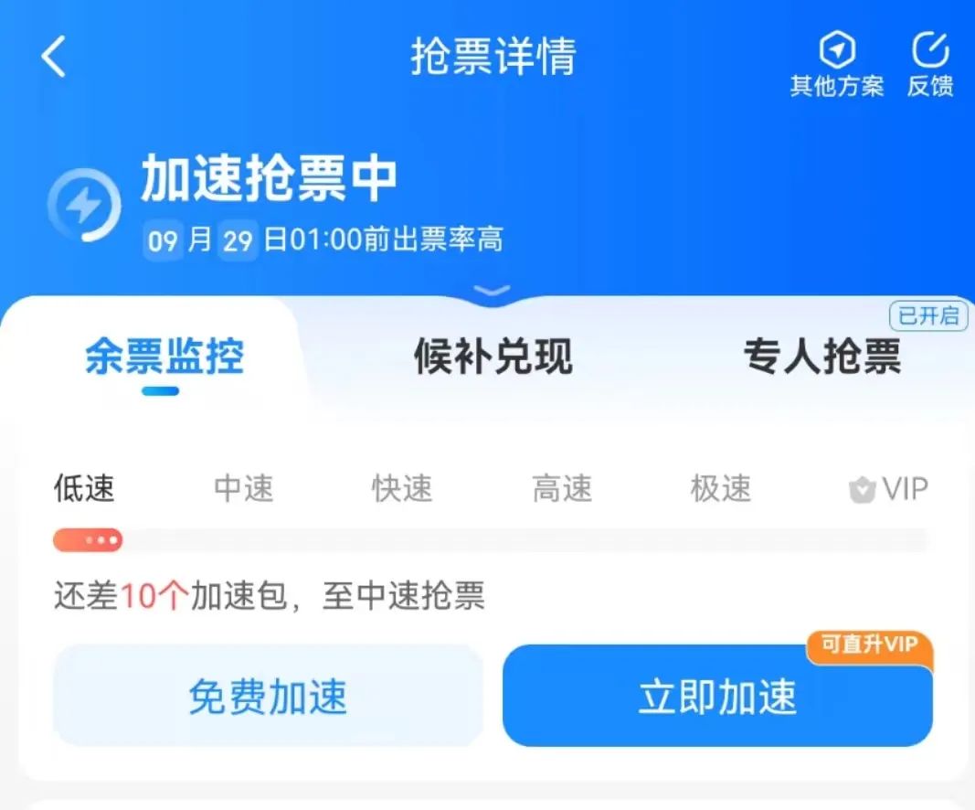 当你在第三方购票平台上选定好了抢票方案,点击确认的那一刻,可能会收到这样的提示:“当前为低速抢票,成功率较低,建议提升到极速抢票,抢中率更高。”