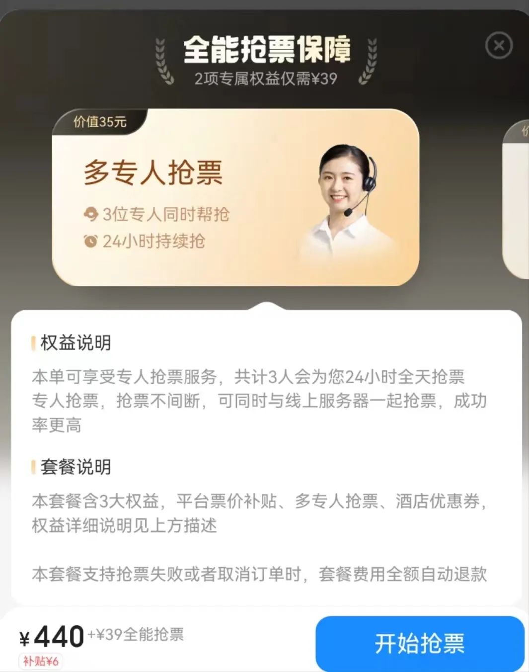 另外,抢票软件还有专人抢票功能,提供机器+人工抢票操作,需要多加39元/人,可升级到全能抢票,据说夜间会有专人到线下窗口去购买。看到这里,繁忙的大城市打工人已经头昏眼花,为了抢到票只好闭着眼睛全部“点亮”,买个心安,一趟火车票,点亮完这些功能,可能要多付89元甚至更多。