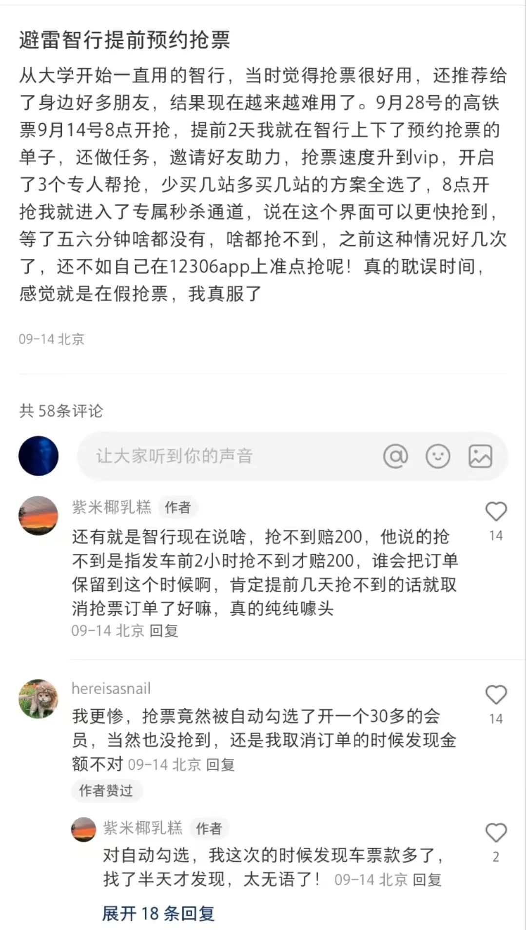 以智行为例,用户可通过购买不同档位的加速包实现抢票,包括低速、中速、快速、高速、极速、VIP等6个档位,升级到VIP速度需要50元/人,如果不想付钱加速,也可以选择分享邀请好友点击助力,但那意味着要消耗大量“社交货币”。