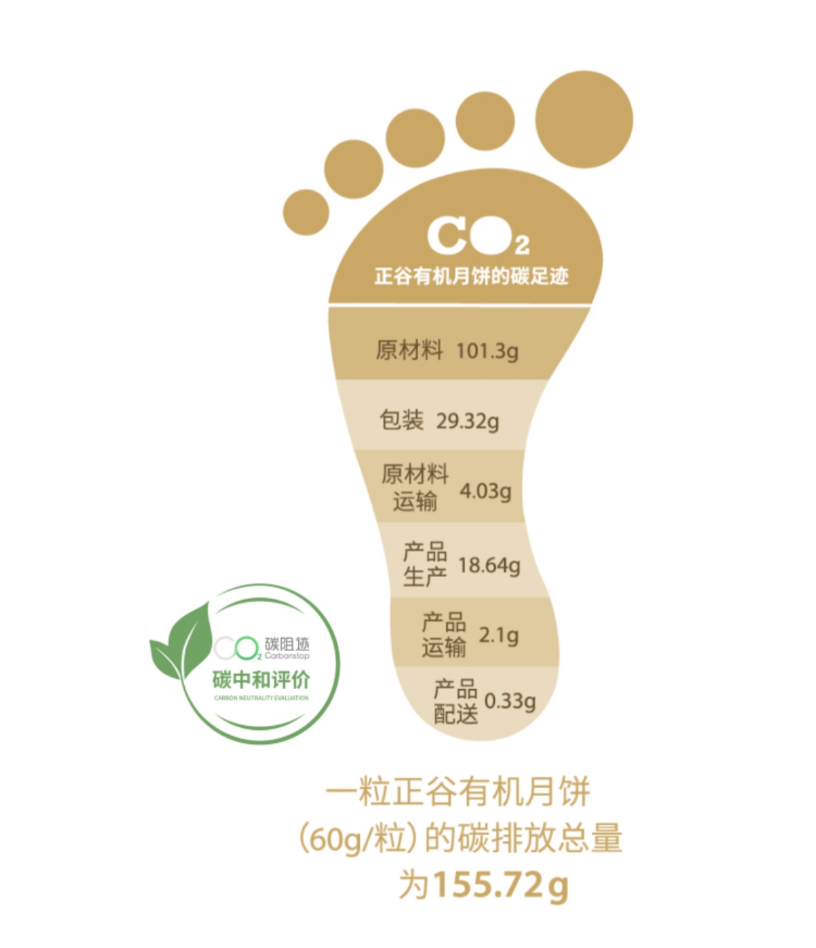 这些碳排放主要来自原材料环节。根据碳阻迹核算,上述一枚60g月饼的生命周期各阶段碳排放分布为:原材料约100g,包装约30g,产品生产约20g,其余少量碳排放来自运输配送环节。