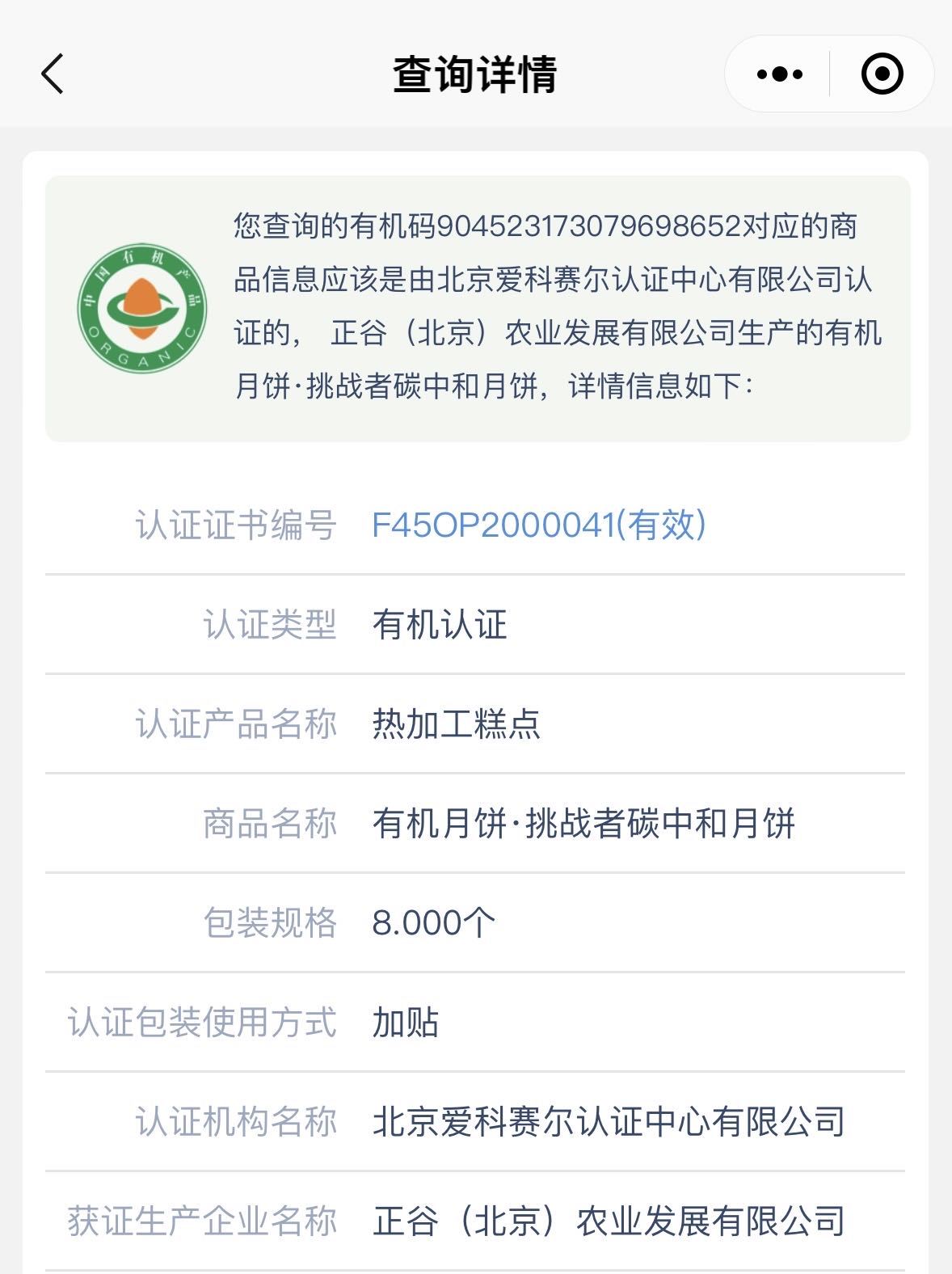 “挑战者碳中和月饼”的有机认证证书