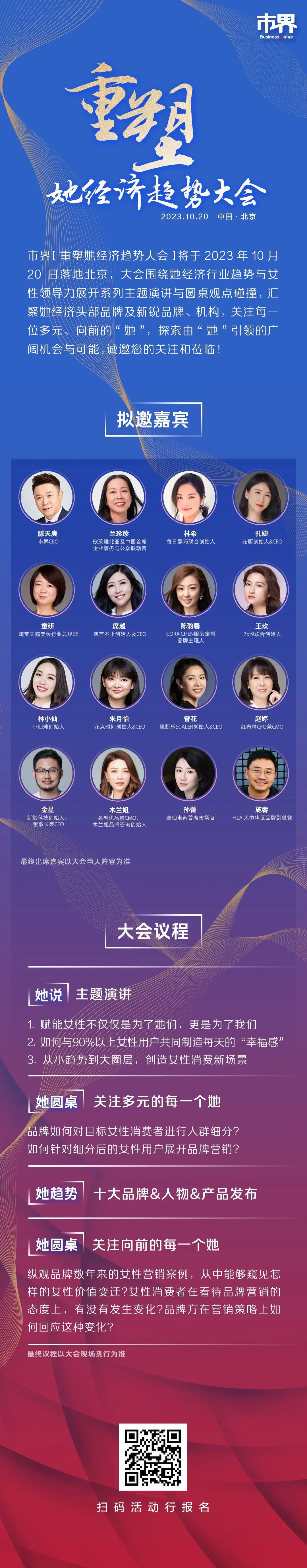为了探寻其中奥秘,「市界」将于2023年10月20日,在北京举办“重新看见她经济的广阔海域——2023重塑她经济趋势大会”。