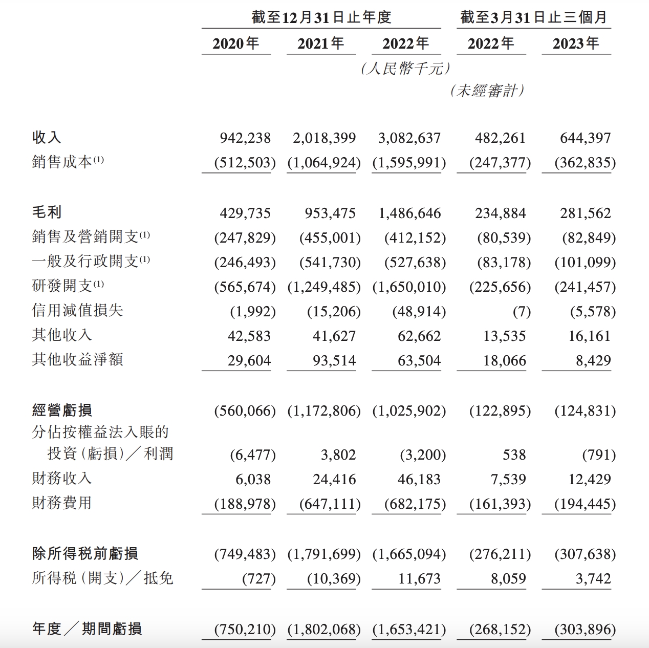 2020年到2023年Q1第四范式综合收益表概要。图源:第四范式招股书
