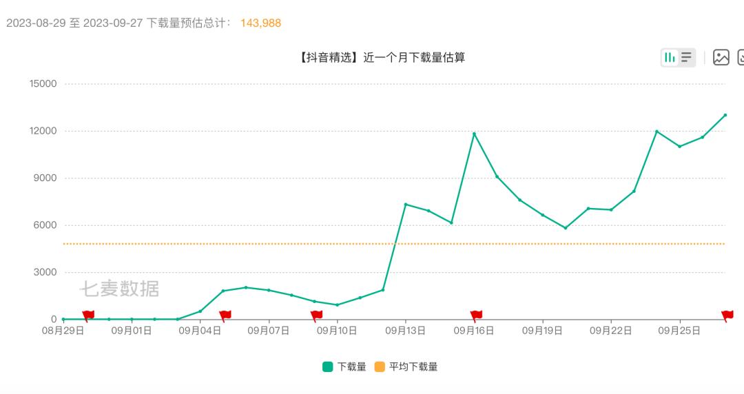 图注:抖音精选APP的日均下载量走势图。(七麦数据)