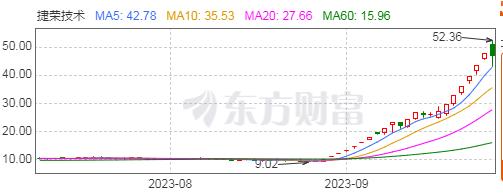 8月28日,捷荣技术收盘价为9.26元/股,而9月27日股价已经达到47.83元/股,涨幅达到416%。