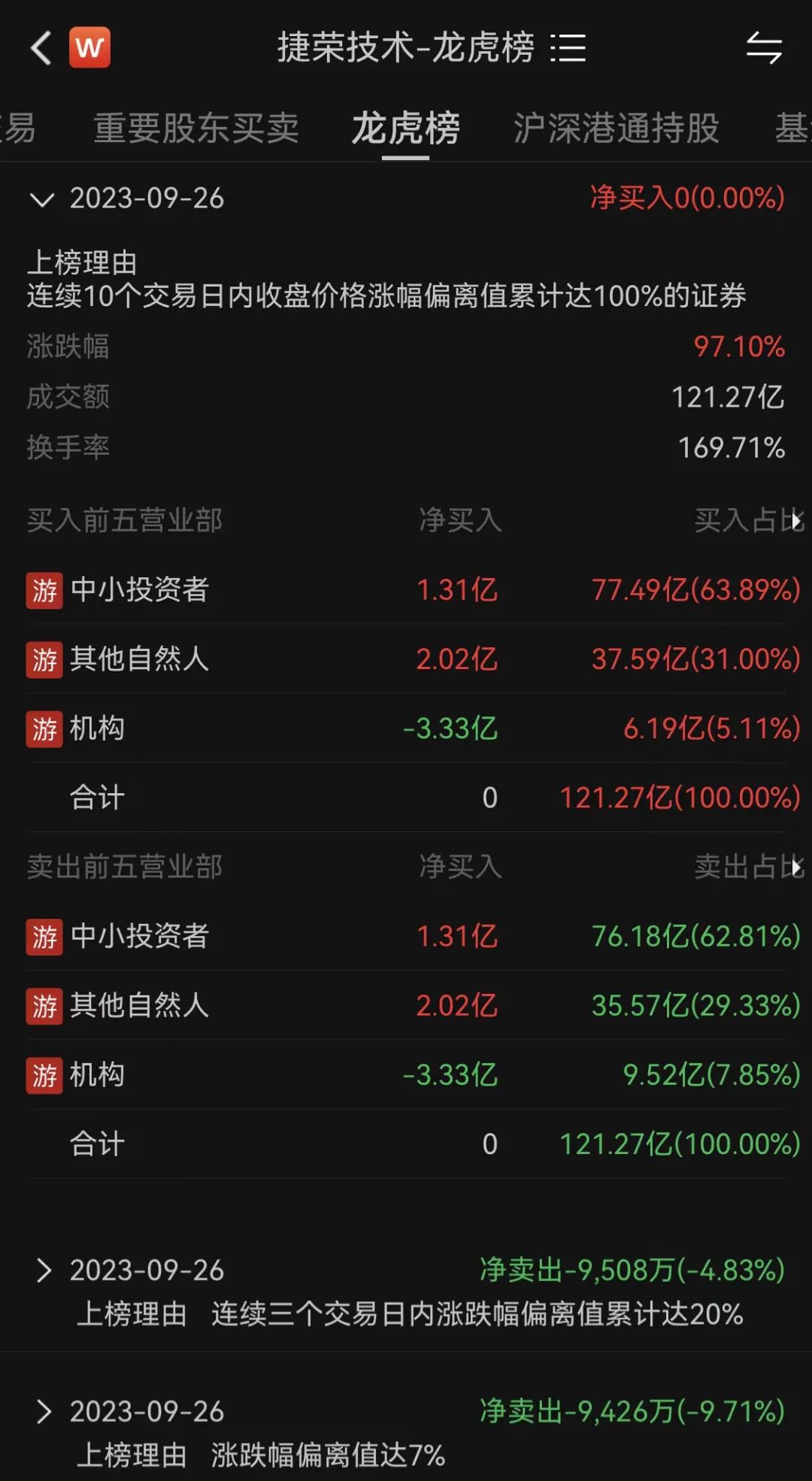 根据深交所披露,因9月13日至9月26日累计几张符偏离值达到100%,捷荣技术属严重异常波动。期间,自然人累计买入115.09亿元,买入占比高达94.89%;累计卖出金额111.75亿元,卖出占比达到92.15%。中小投资者买入占比63.89%,卖出占比62.81%;机构投资者买入占比5.11%,卖出占比7.85%;深股通投资者参与为0。