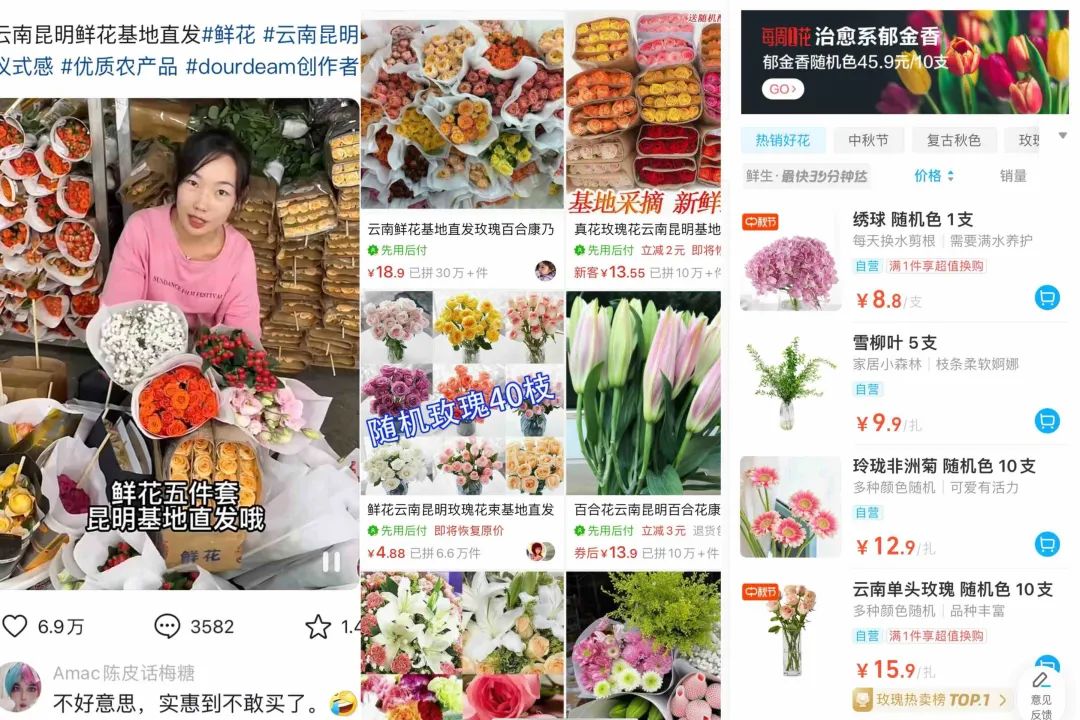 ▲(抖音、拼多多、盒马鲜花截图)