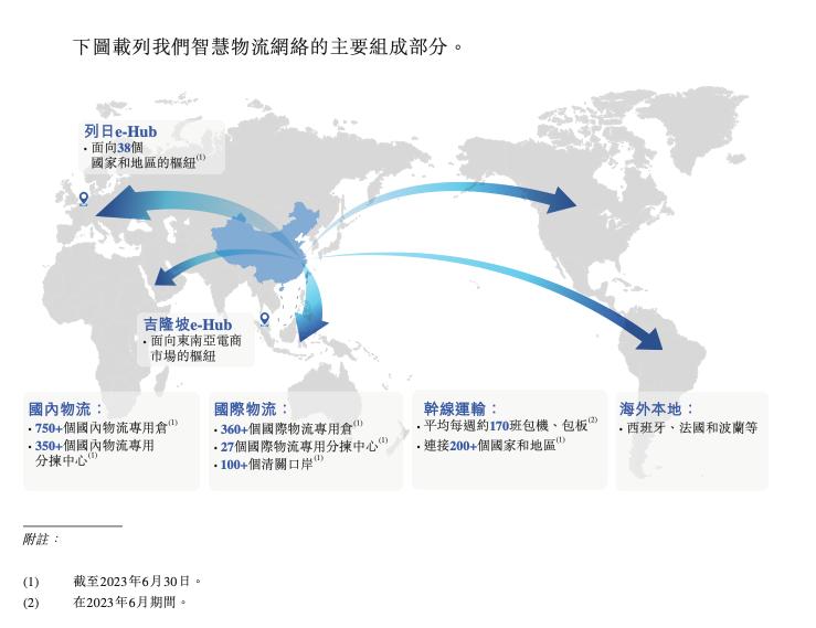 截至2023年6月,菜鸟的全球网络遍布200多个国家及地区,包括2个e-Hub,1100多个仓库及380多个分拣中心,超4400个国内物流网点及17万个驿站。其中,菜鸟的跨境电商仓库是全球最大的,达到300万平方米。