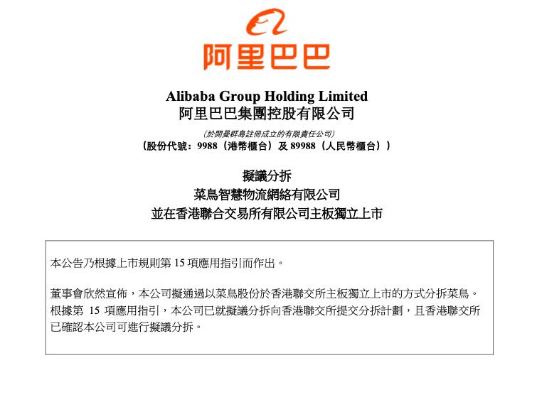 9月26日,阿里巴巴发布公告称,拟以菜鸟在港交所主板独立上市的方式分拆菜鸟。当天晚上,菜鸟就向港交所递交了上市申请文件。