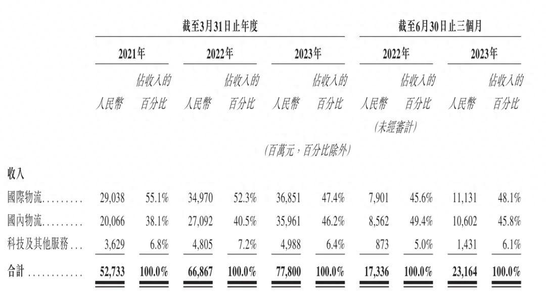 招股书中,菜鸟营收的重心相对聚焦在国际物流市场。菜鸟的收入由国际物流、国内物流和科技及其他服务三项组成,2021-2023财年,菜鸟国际物流收入占总收入的比重持续高于国内业务,三年来分别为55.1%、52.3%和47.4%。