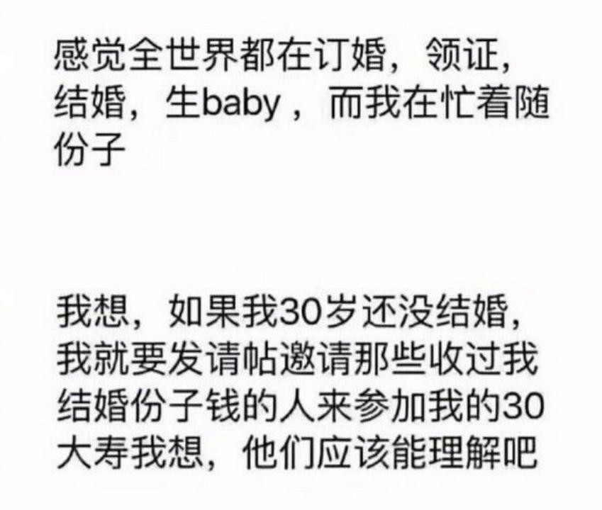 礼重未必情意重,礼轻未必情意轻,份子钱的多寡早已不能衡量人们之间的关系。当份子钱成为一种经济压力,我们真的还有必要为了自己的“社会生命”,顾着面子将随份子的习俗继承下去吗?