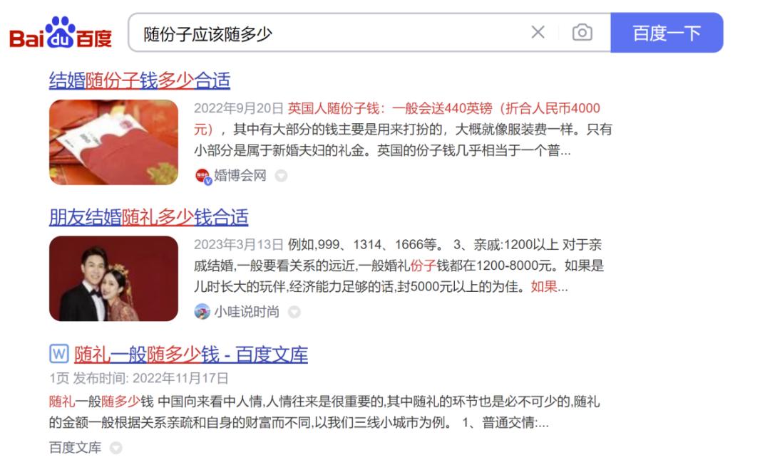 在百度搜索“随份子应该随多少”这一词条,我们能收获46,800,000个相关内容。