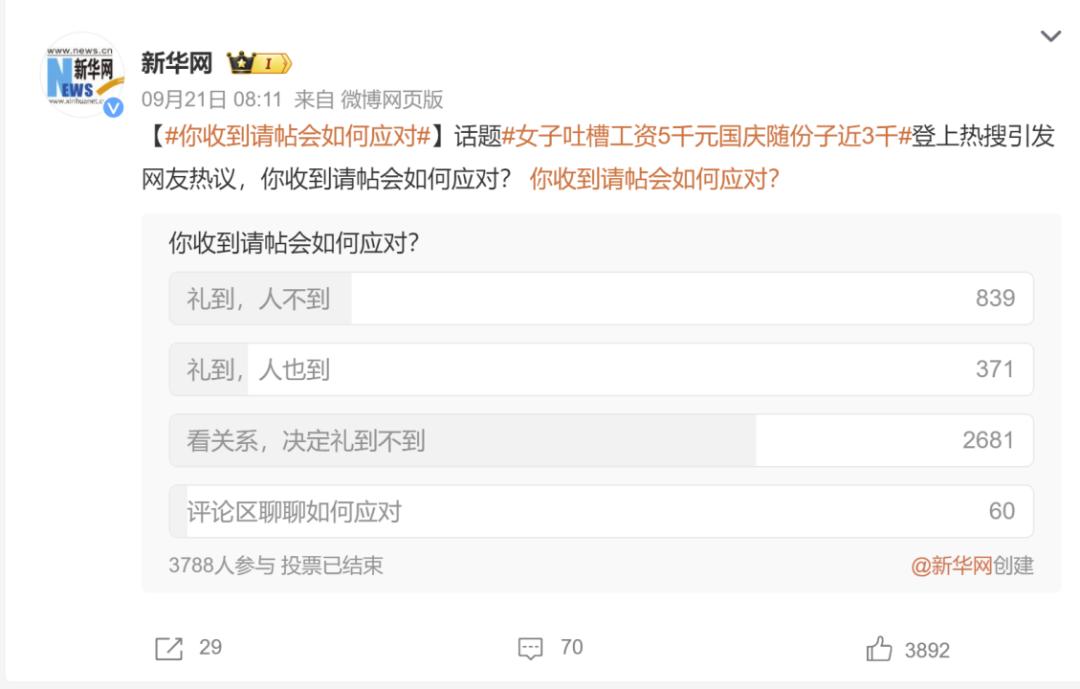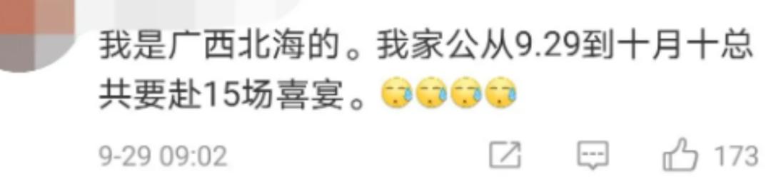 更何况随着各地份子钱“行情”水涨船高,对大众造成了实质的金钱压力,再碰上国庆小长假这样的婚礼扎堆的日子,必然是“钱包渐瘪终心碎,为情消得人憔悴”。