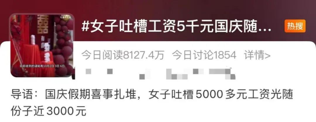 近日“大学生蹭酒席随礼100元被指太少”“女子吐槽工资5千元国庆随份子近3千”等话题冲上热搜,再次引起了网友对“随份子”的强烈热议。
