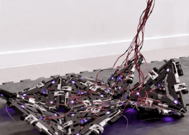和我们常见的设计初期就固定成某个形状的机器人不同,瑞士洛桑联邦理工学院的团队设计出来的机器人 Mori3,由一堆零散的「三角形」组成,在完成特定任务时,这些三角形会自动组合,组成最合适完成任务的形态。