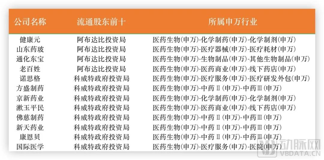 科威特政府投资局从去年第四季度开始,陆续买入康恩贝、方盛制药、京新药业、华润三九等公司股票,并成为数家公司排名前十的流通股东。阿布达比投资局也在通化东宝、老百姓、健康元等企业流通股东中进入前十。