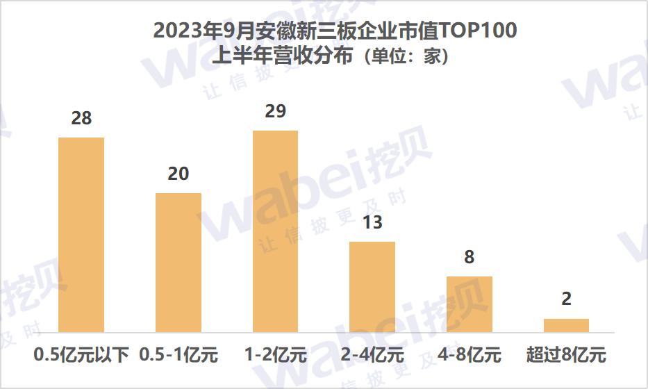 从上榜公司今年上半年营业收入来看,TOP100中有久易股份、金誉股份2家企业营业收入超过8亿元,分别达到8.66亿元、19.59亿元,8家企业营收在4-8亿元,营收在2-4亿元、1-2亿元、0.5-1亿元的企业分别有13家、29家、20家。另外,营收在5000万元以下的有28家。