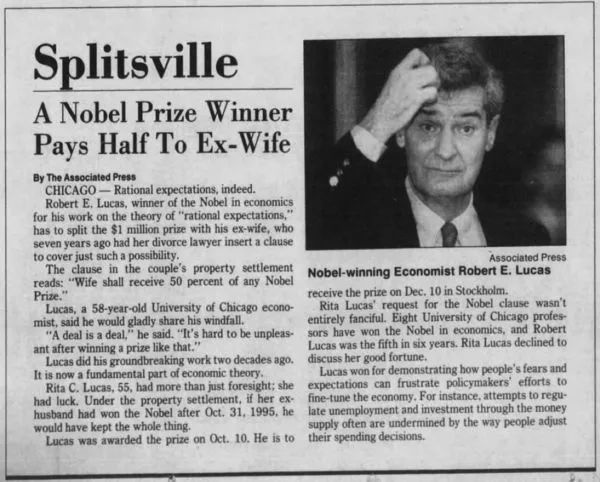 1995年,经济学家罗伯特·卢卡斯 (Robert Lucas) 获得诺贝尔经济学奖。他处理奖金的方式有点特殊——需要把钱分一半给前妻,因为前妻很有先见之明地在离婚协议写着她将获得诺贝尔奖奖金的50%。