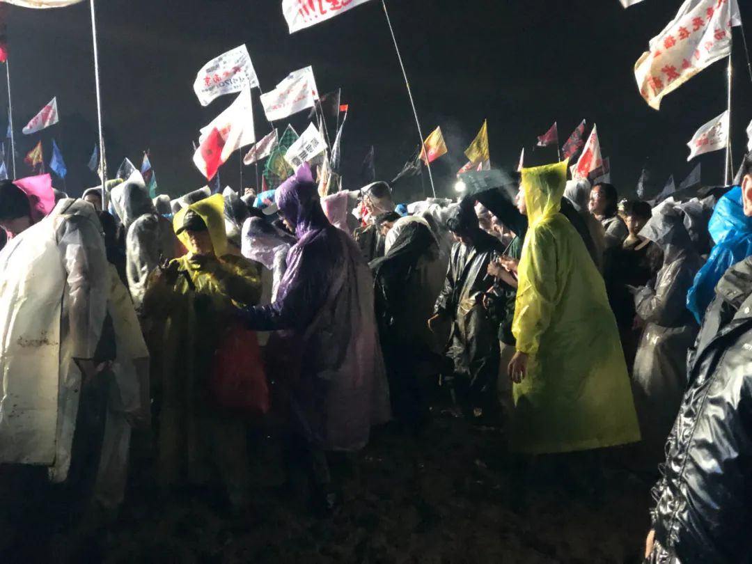 有一对情侣浑身是泥汤,他们陷在了泥潭里,已经不能往舞台的方向挪动。男孩帮女孩把胶鞋拔出来,女孩把两只胶鞋放到胸口位置给周围的乐迷展示,随后把胶鞋放到泥潭里,手插进泥泞里,在男朋友白色T恤上印手印。只要有人陷在泥潭里,大家就一起喊“加油!加油!”有人还会把手搭过去,拉上一把。前面有人撑着伞,后面的人一起喊“关伞!关伞”,伞关掉以后,众人鼓掌呐喊。