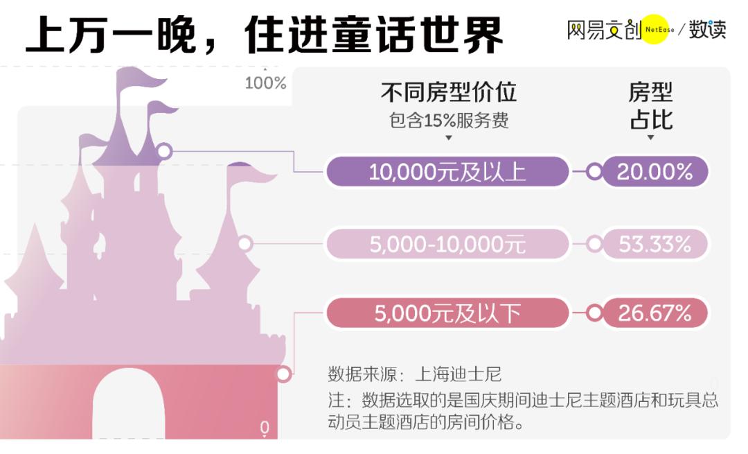 迪士尼的两家主题酒店都有 15% 服务费。玩具总动员主题酒店里,最便宜的房间超过 2000 元,迪士尼主题酒店的房间 5000 元起步,最贵的住一晚要 16000 元[13]。