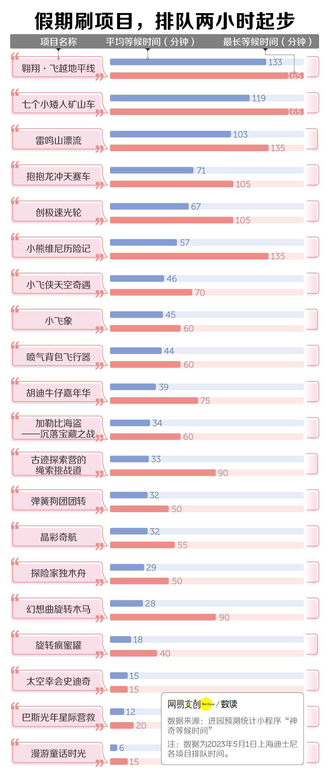 等好不容易绕进了园,热门项目两小时起步。根据进园预测统计小程序“神奇等候时间”的统计数据,今年五一,飞跃地平线和七个小矮人矿山车的最长等候时间都接近三个小时,平均排队时间在两个小时左右 [10]。十一的排队时间只可能更多。