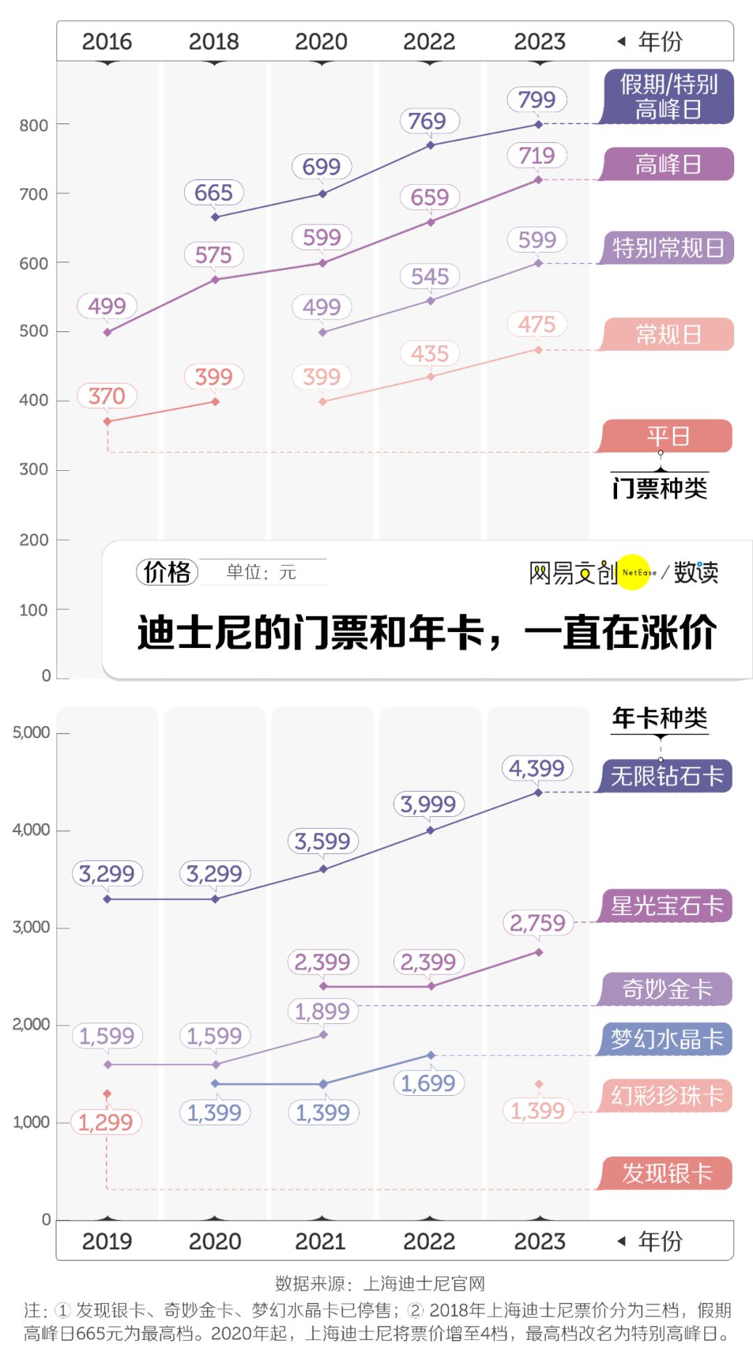 年卡也跟着变贵了。365 天无限次入园的无限钻石卡,从 3999 元涨到 4399 元。新增的珍珠卡价格最低,只需 1399 元,但只能工作日去,绝大多数打工人和非上海居民都用不上 [3]。