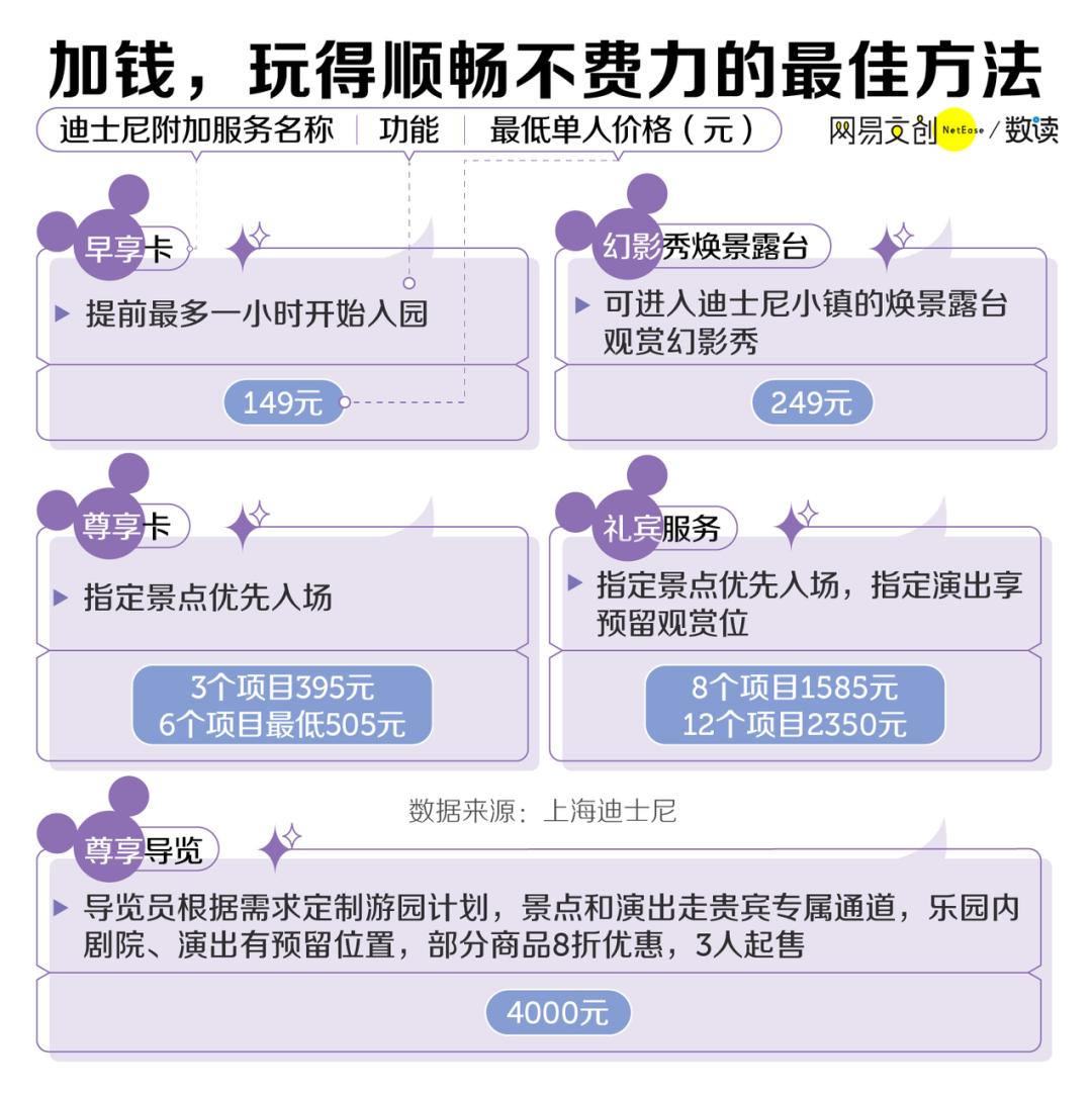 在迪士尼,1055 元的尊享卡可以走八个热门景点快速通道,走快速通道还能给灯光秀预留位置的礼宾服务 1585 元起步,个性化定制游玩项目、走贵宾专属通道的尊享导览每人 4000 元,三人起售 [12]。截至 9 月 25 日,国庆假期的导览票已全部售罄。