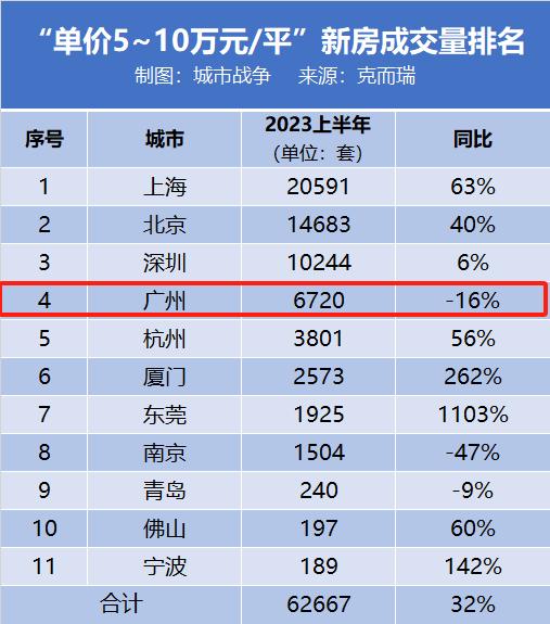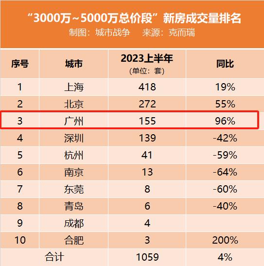 3、总价越高,广州越能打。千万级豪宅成交量,广州排名全国第五,但3000万以上豪宅成交量,广州排名全国第三,超过深圳杭州。5000万以上豪宅成交量,广州更是与深杭拉开差距。