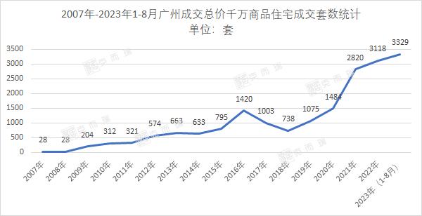 克而瑞数据显示,2023年1-8月广州总价1000万以上新房共成交3329套,仅用8个月就超过去年全年 (3118套) ,不仅如此,还创下近十年新高,见下图: