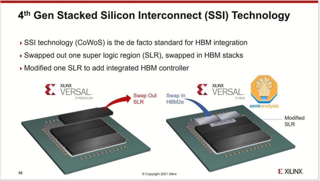 虽然台积电的SoIC等3D封装技术可以将芯片直接堆叠在逻辑之上,但由于散热和成本的原因,这对于HBM来说没有意义。SoIC在互连密度方面处于不同的数量级,并且更适合通过芯片堆叠扩展片上缓存,如AMD的3DV-Cache解决方案所示。AMD的赛灵思也是多年前CoWoS的第一批用户,用于将多个FPGA小芯片组合在一起。