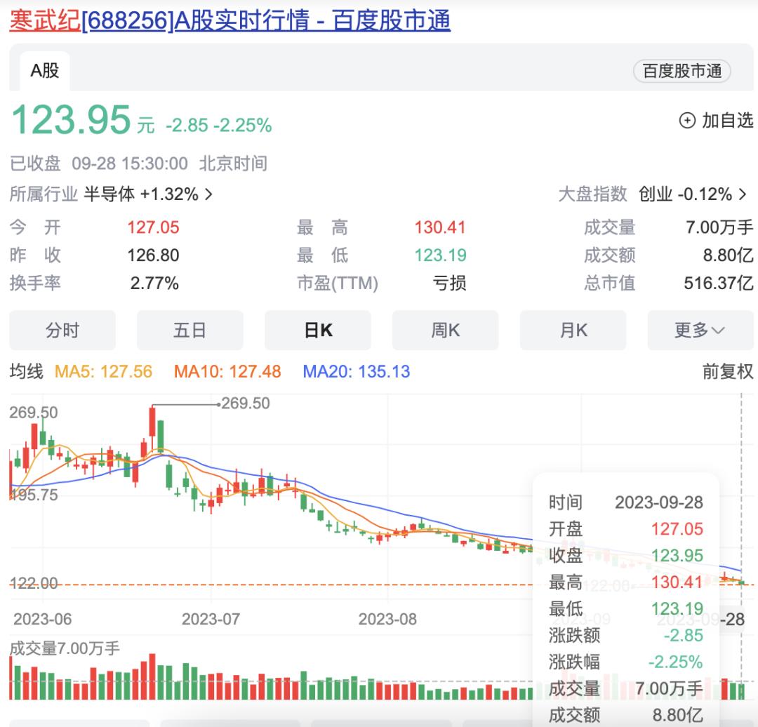 年初第一个交易日,寒武纪的收盘价为56.78元/股,至4月21日曾一度站上271.47元/股,哪怕之后股价回落,截至9月28日依然高达123.95元/股,总市值依然超过500亿元人民币。