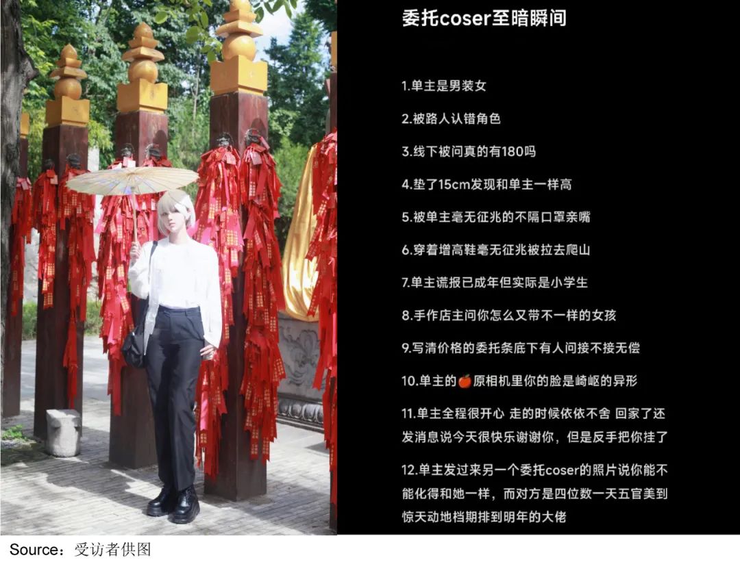 那一天,她陪了对方9个小时,时薪40块钱,减去自费买cos服的几十块钱(虽然扮演的角色可能身家上亿),一天净赚300。