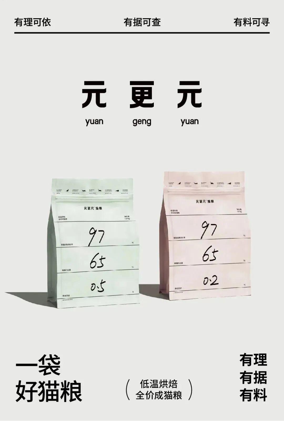 「元更元」对猫粮的研发标准为「有理、有据、有料」。包括在正式研发产品之前对内部员工的需求进行了调查,针对「宠物健康」这一占比最多的困惑进行调优;在关注到一块烘干的鸡胸肉含有62%的蛋白质之后,「元更元」把标准就定为了60%;在包装设计上提出了「数字猫粮」的概念,借此向用户传达对数据标准的重视。