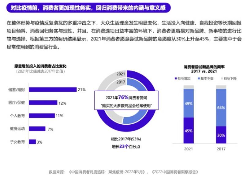 根据《2023中国新消费趋势白皮书》,网上零售份额从2021年的24.5%提升到去年27.2%,用户的网购热情还在上涨。与此同时消费理念则回归理性务实,更多的消费者希望购买经常使用的商品,也更愿意去尝试新品牌。