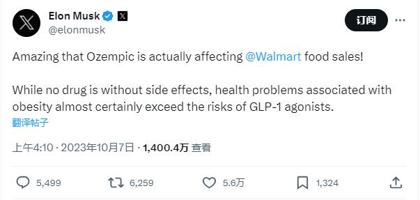 尽管如此,北京时间10月7日凌晨,马斯克还在推特(现X)上为减肥药“背书”,他称,“减肥药Ozempic影响了沃尔玛的食品销售这点令人震惊。虽然没有一种药是没有副作用的,但几乎可以肯定的是,肥胖相关的健康隐患超过了GLP-1受体激动剂的风险。”截至发稿,马斯克此条推文已经获得超1400万次阅读。