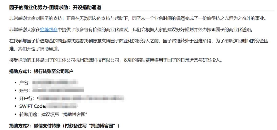 但搞商业化也得有一点启动资金吧,并且博客园已经几乎没有了收入来源,最基本的生存都维持不下去。于是他们直接搞了个捐助通道,把银行卡号、付款码啥的都贴在了公告上。