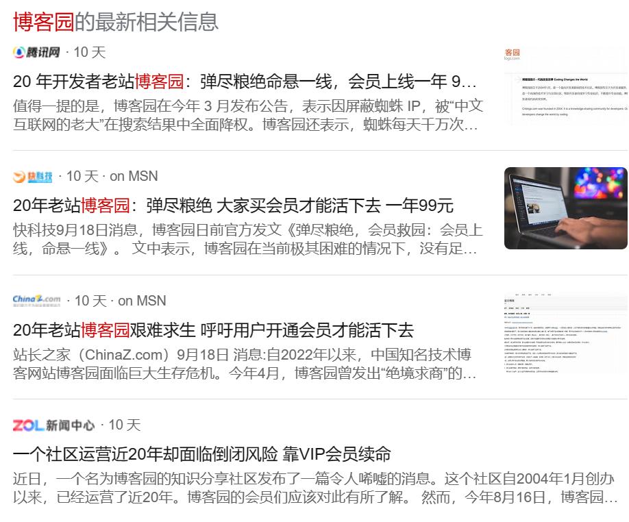在搜索引擎上搜索博客园,弹出的新闻都是它快不行的消息。。。