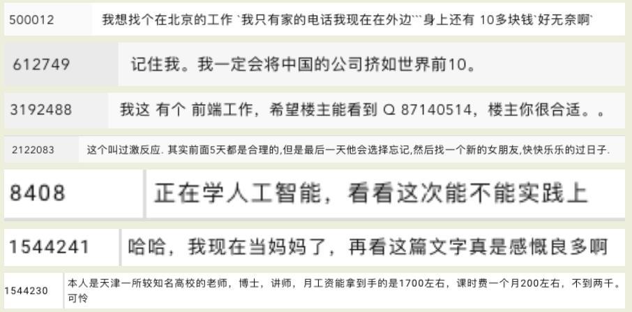 像什么口袋里只有 10 块钱想去北漂,博士毕业在高校做讲师月入不到 2000 ,还有园友评论给帖主推荐工作等等等等。