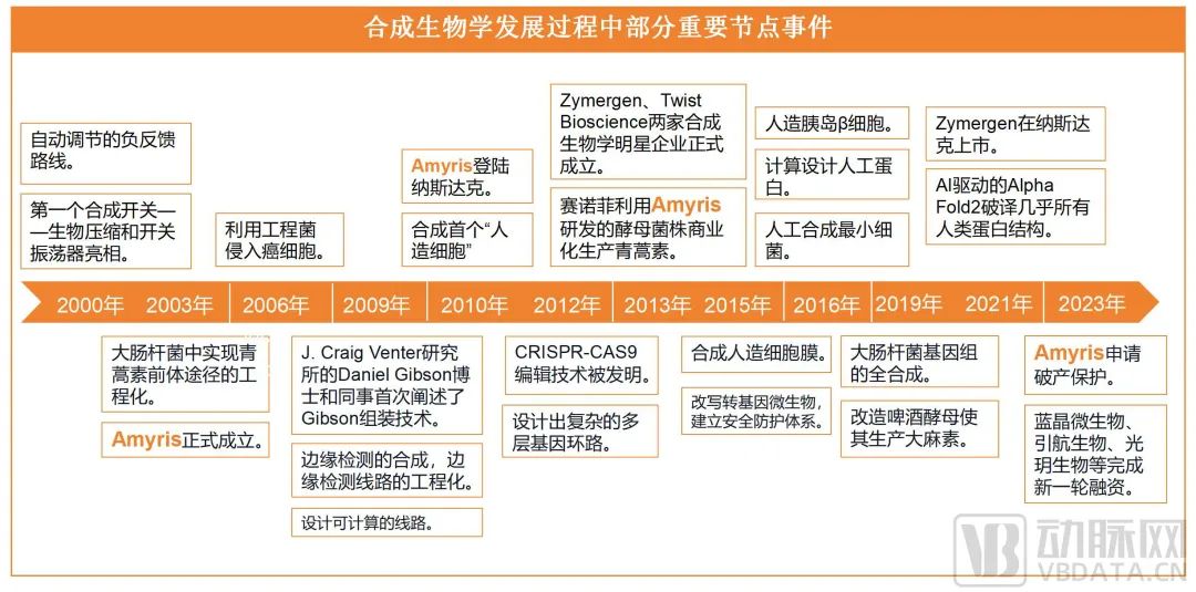 (合成生物学发展过程中部分重要节点事件 动脉网制图 数据来源:互联网公开资料)