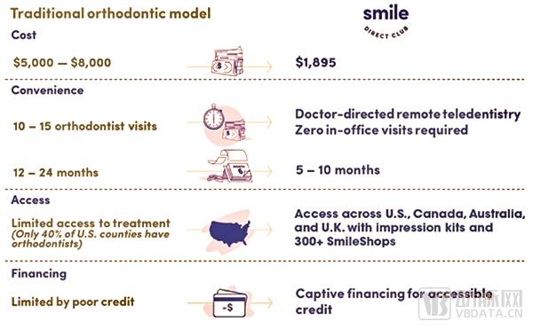 这套模式使得正畸成本下降。根据Smile Direct Club招股书的数据,传统牙齿正畸收费为5000-8000美元,而Smile Direct Club因省去中间商环节,仅需1895美元。