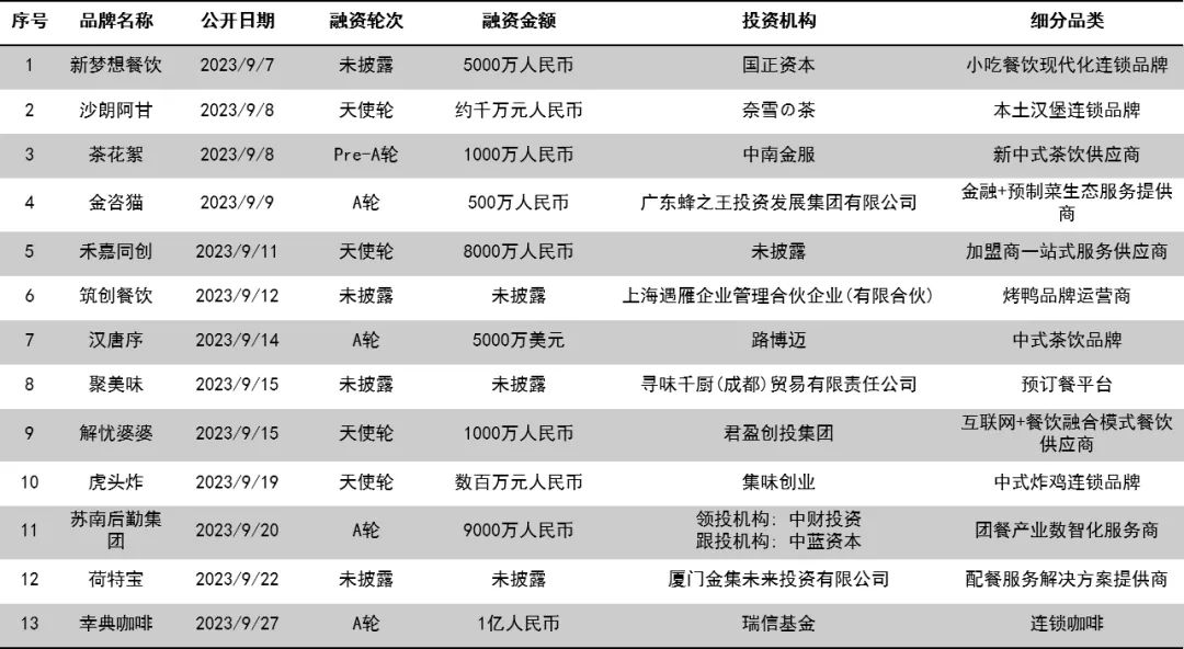 如果信息属实的话,9月份,餐饮领域就有4家企业获得近亿元的投融资,包括加盟商一站式服务供应商“禾嘉同创”、新中式茶饮品牌“汉唐序”、团餐产业数智化供应商“苏南后勤集团”和连锁品牌“幸典咖啡”。