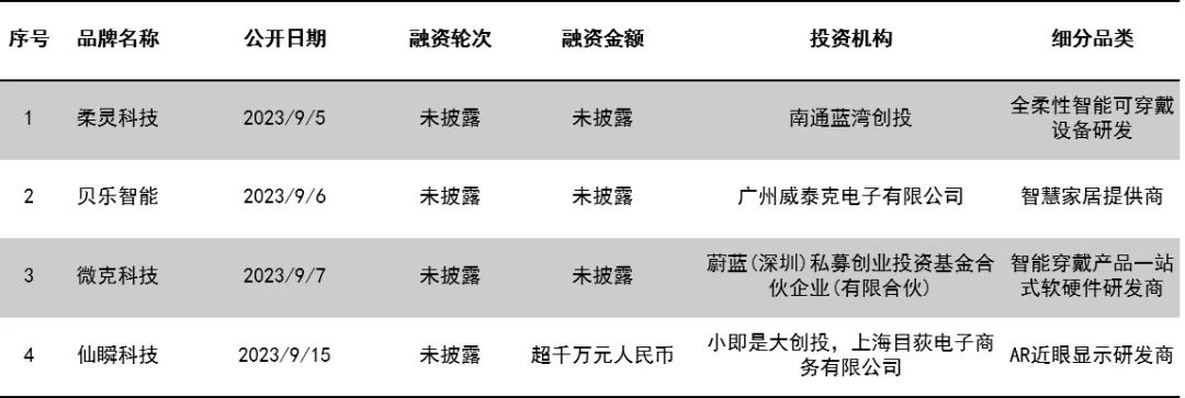 9月,共有4家消费级智能硬件企业公开融资,除了“贝乐智能”从事智能家居外,其他3家的主营业务均为智能可穿戴设备软硬件研发商。在智能可穿戴领域,AR眼镜一直备受资本关注,2023年1-8月,共有8家AR眼镜相关企业获融资,本月,“仙瞬科技”成为又一家获资本青睐的AR眼镜研发商。