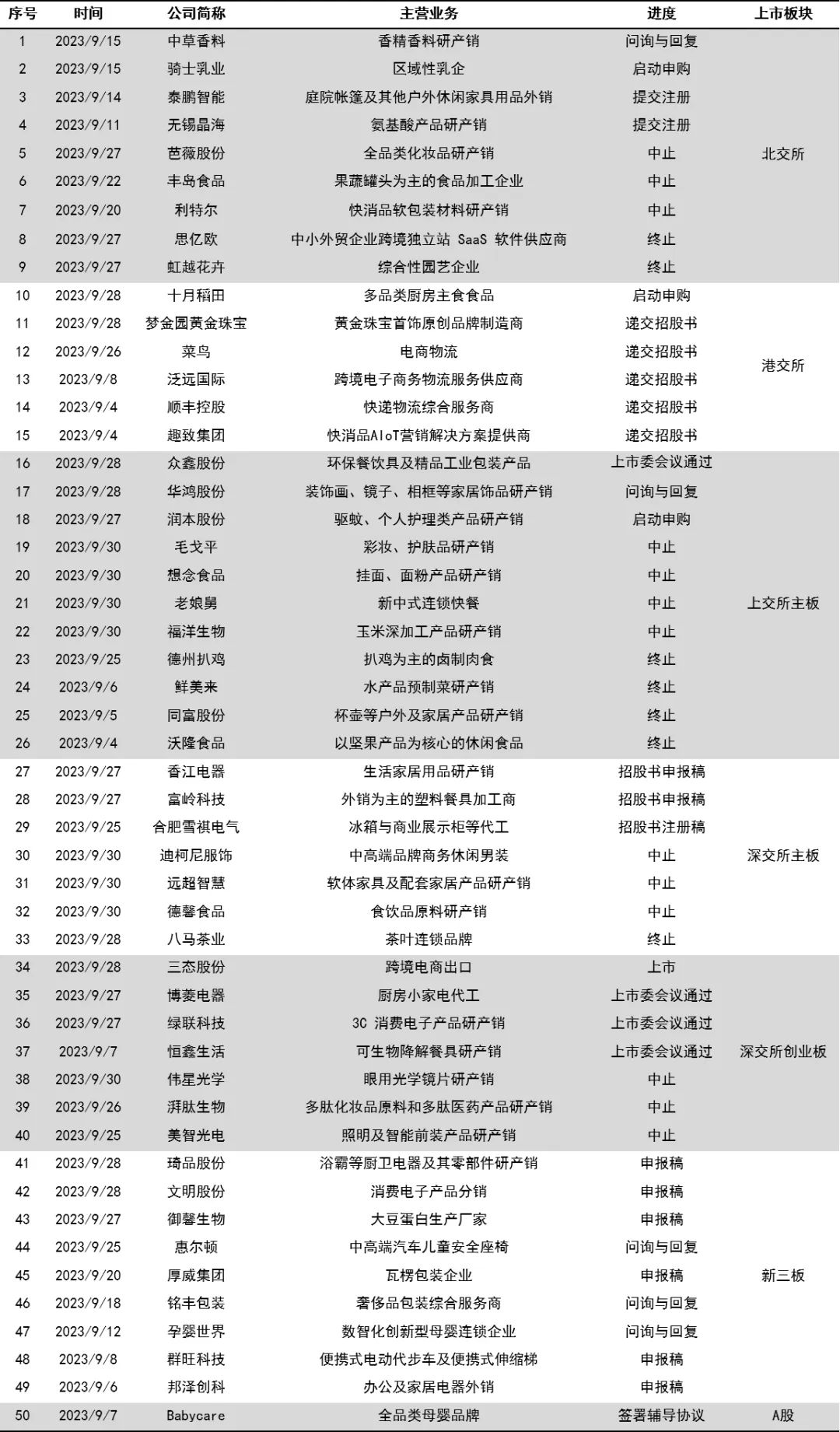 据蓝鲨消费不完全统计,9月消费领域投融资事件50起,其中,有1家上市,3家启动申购,7家撤回IPO申请终止上市,13家因财务资料失效中止审核,25家消费相关企业IPO有新进展,母婴品牌“Babycare”签署上市辅导协议,拟A股上市。